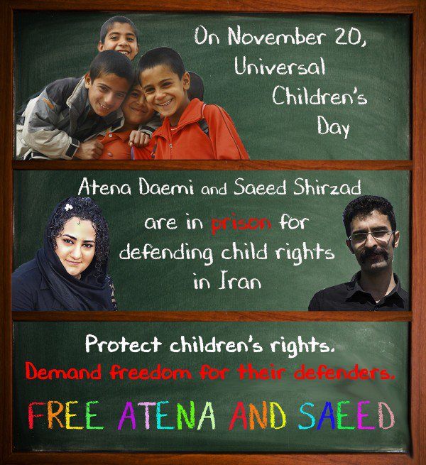 Behind bars on #UniversalChildrensDay: #Iran’s Child Rights Defenders http://bit.ly/1S6tyFD #FreeAtena #FreeSaeedpic.twitter.com/isacbhRAaW