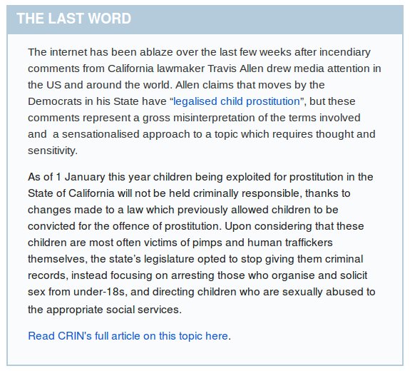 Includes a link to our discussion of the decriminalisation of children being exploited for prostitution in #California (not 'legalisation').pic.twitter.com/izCeCqYoqg