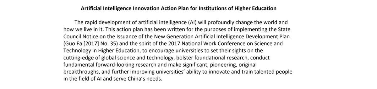#AI education, which outlines objectives to enhance China’s cadre of AI talent & university AI curricula by 2030. http://bit.ly/2OHfE2I pic.twitter.com/0gE6i9SpHB
