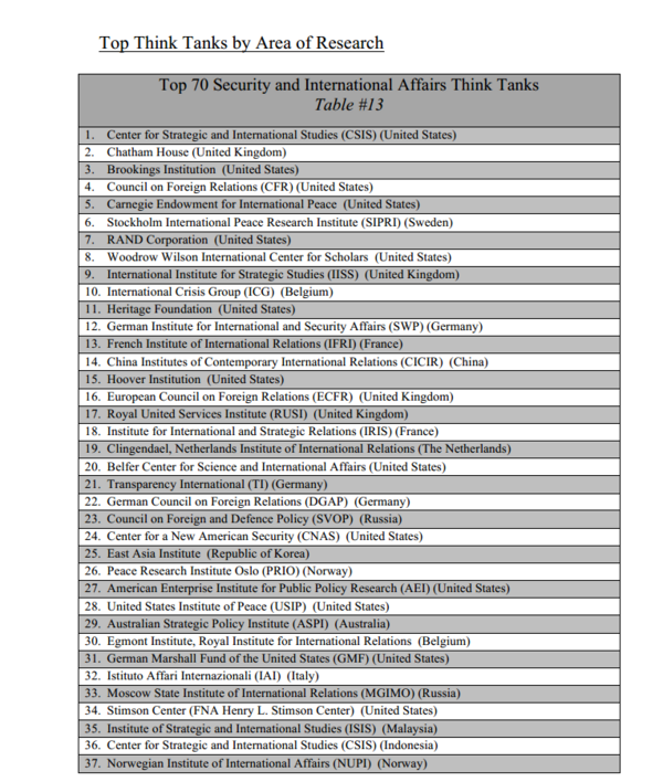 @CSIS: CSIS was ranked #1 Security and International Affairs Think Tank by@TTCSP Read: http://www.gotothinktank.com/wp-content/uploads/2013/01/2012_Global_Go_To_Think_Tank_Report_-_FINAL1.pdf … pic.twitter.com/47LXzeq6”