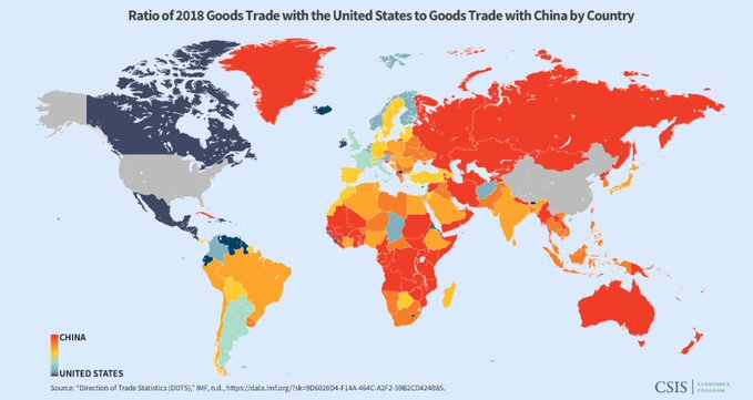 Most countries have a larger merchandise trading relationship with China than with the United States—complicating the ability to "pick a side" between the U.S. and China. See this map and more in @CSIS_Econ’s August Global Economics Monthly newsletter. http://bit.ly/3hJmSAI pic.twitter.com/1aHmhInjK0
