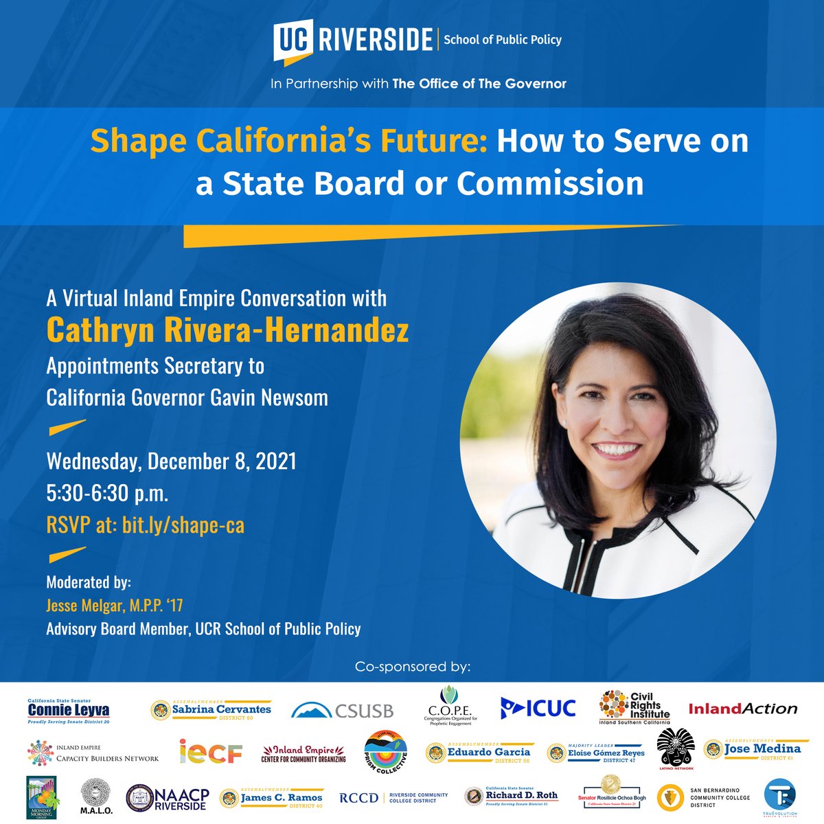 @ucrspp for their Shape California's Future event on Dec.8th as they discuss how to serve on a state's board or commission in partnership with the@CAgovernor and their guest speaker, Appointments Secretary Cathryn Rivera-Hernandez! RSVP: http://bit.ly/shape-ca pic.twitter.com/dwmevFnJuY