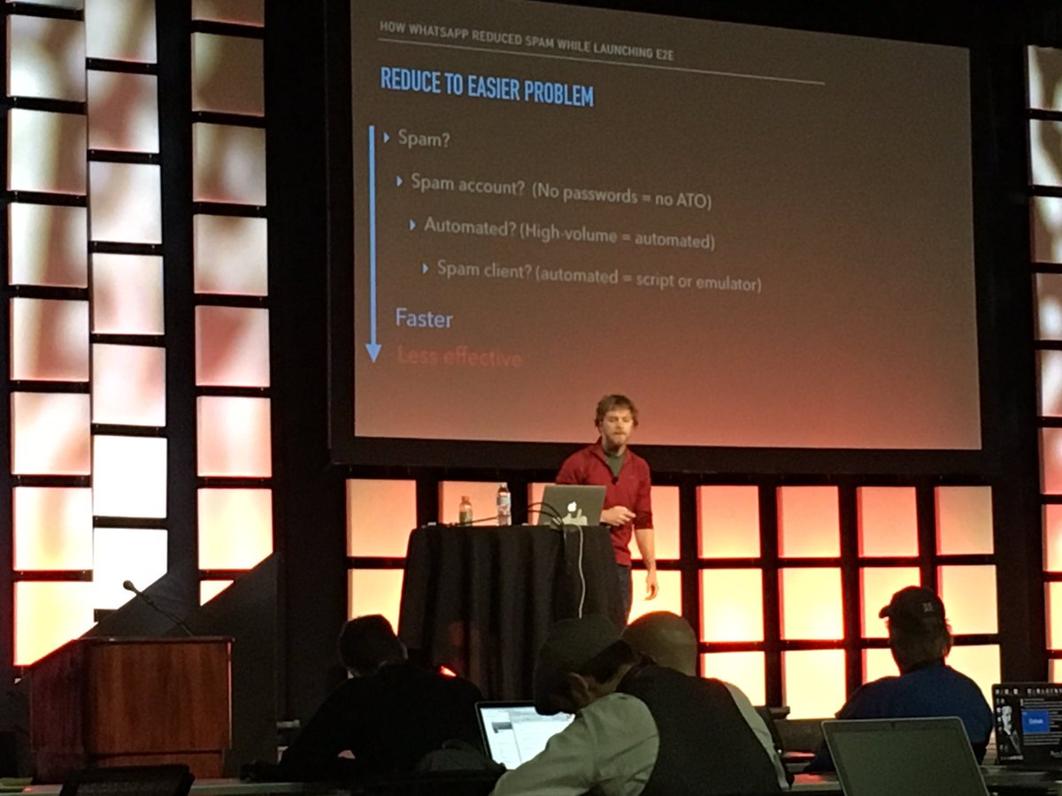 Tweeting from #enigma2017 this morning. Matt Jones explains how @WhatsApp reduced spam implementing E2E encryptionpic.twitter.com/2XEVATt0aO