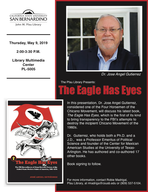 Join us for a presentation by Dr. Jose Angel Gutierrez, considered one of the Four Horsemen of the Chicano Movement, who will discuss and sign his latest book, The Eagle Has Eyes.pic.twitter.com/9hu2aZeYBU