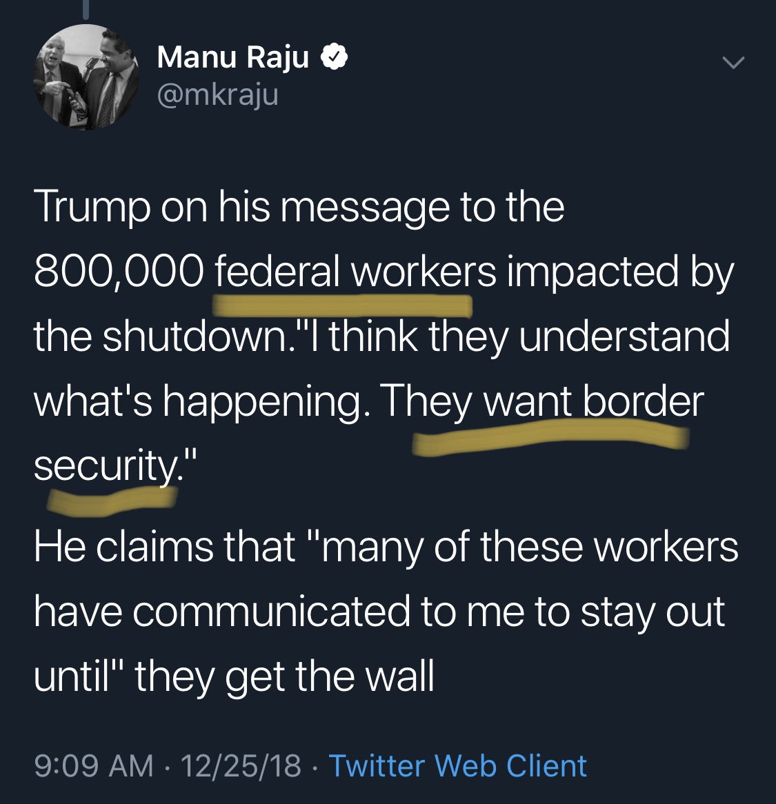 "Don't the Democrats realize the hostages I've taken are THEIR PEOPLE? Why won't they pay the ransom I am demanding?"https://twitter.com/atrupar/status/1078297469342179329 …
