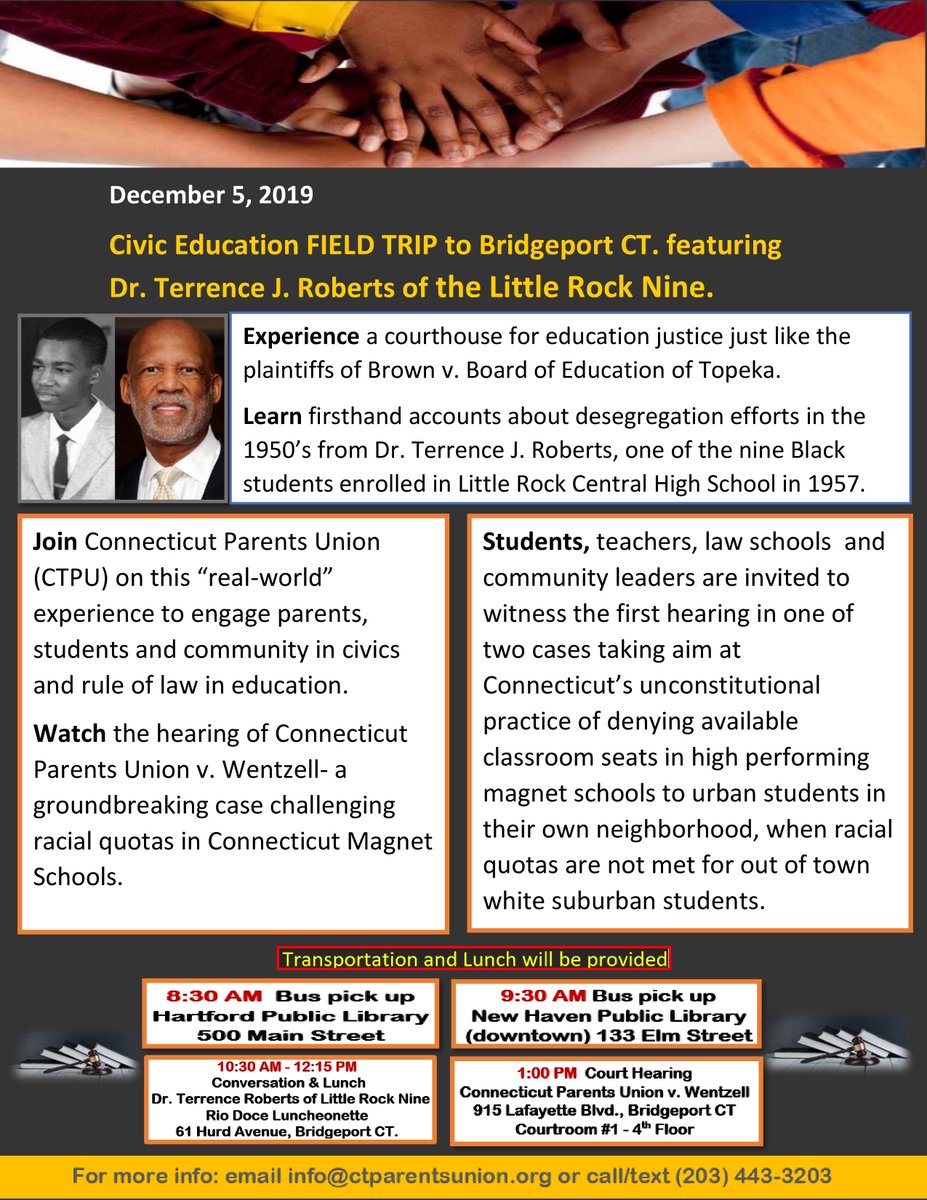 @CTparentsunion on a Civic education Field Trip w. guest speaker Dr. Terrence J. Roberts of the Little Rock Nine followed by our Court Hearing Connecticut Parents Union v. Wentzell.CTPU challenges unconstitutional racial quotas in CT's Forced Integration lawpic.twitter.com/Rm9itYjd5D