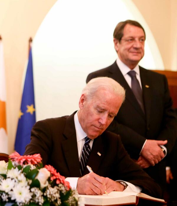 Ο Αντιπρόεδρος των ΗΠΑ κ. Joe Biden υπογράφει το βιβλίο επισκεπτών του Προεδρικού Μεγάρου #Cypruspic.twitter.com/dQO021Nlth