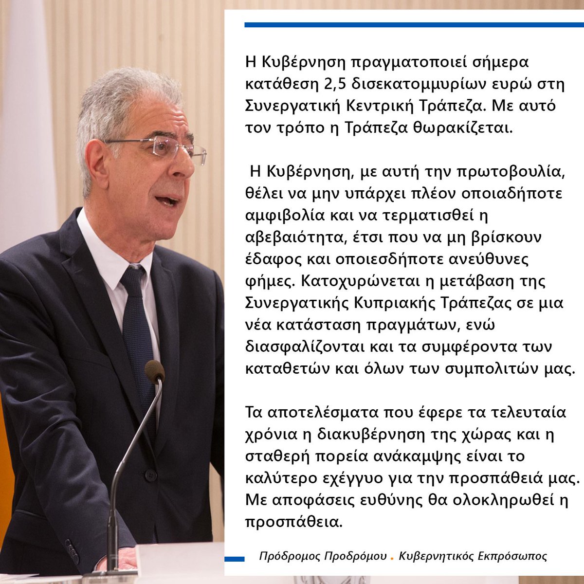 Κατάθεση 2,5 δισ. ευρώ προς τη Συνεργατική Κυπριακή Τράπεζα, ανακοίνωσε ο Κυβερνητικός Εκπρόσωπος @pprodromou: https://bit.ly/2JgKOu8 pic.twitter.com/2iVWKnKqeX