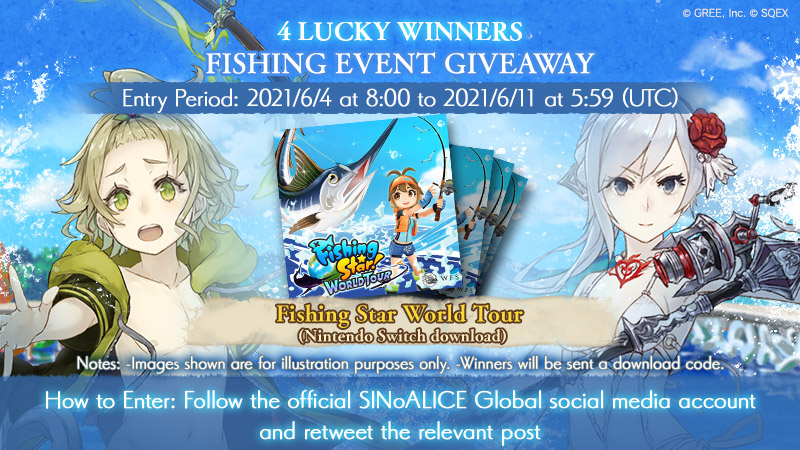 Fishing Event Giveaway! 4 users can win "Fishing Star World Tour" (NintendoSwitch DL)! How to Enter Follow the official SINoALICE social media account & RT post Period 2021/6/4 8:00 ~ 2021/6/11 5:59(UTC) Details https://sinoalice.global/en/news/60b4c576 …