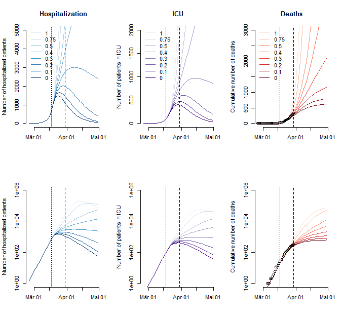 [Achtung, Tweet ausserhalb meiner Expertise] Ich habe mir erlaubt, das Modell von @C_Althaus in R neu laufen zu lassen. Ergebnisse: Schweiz hat R0 um 65% reduziert Peak ICU wäre um den 15 April erreicht (Linien 0.3-0.4 in Abbildung). Kriegt ihr das auch so?pic.twitter.com/p7AavYAi7S