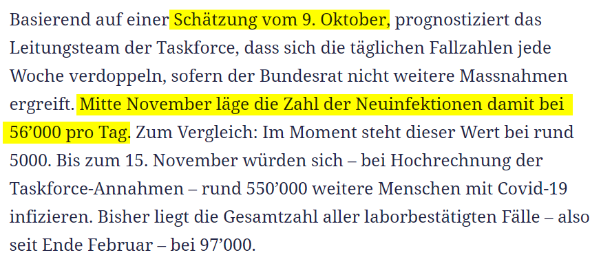Schon eine Grundannahme ist falsch. Am 9. Okt. betrug der 7-täg. MW der Neuinfekt. ca. 1'000/Tag. Zwischen dem 9. Okt. und Mitte Nov. liegen 5 Wochen. Also beträgt unter der Annahme einer Verdoppelung jede Woche die geschätzte Anz. Neuinfekt. Mitte Nov. bei 2^5 x 1'000 = 32'000.pic.twitter.com/JHQ9XJ200b