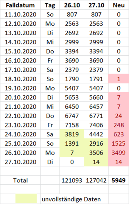 Die Publikation der laborbestätigten Fälle haben sich seit kurzem über mehr Tage verteilt.https://twitter.com/erwinheim/status/1321047615308550144 …