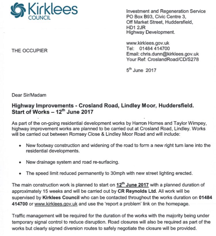 Highway Improvements (New Footway, Street lighting and Speed limit reduction) to start on 12th June - Crosland Road, Lindley.