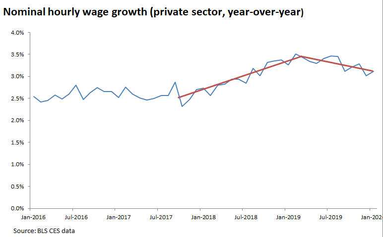 #JobsDay reminder of where we are on wage growth. From late 2017 through the beginning of 2019, it looked like wage growth was picking up. THAT ENDED. Over the last year, wage growth has lost ground.pic.twitter.com/JFbDhVU8zk