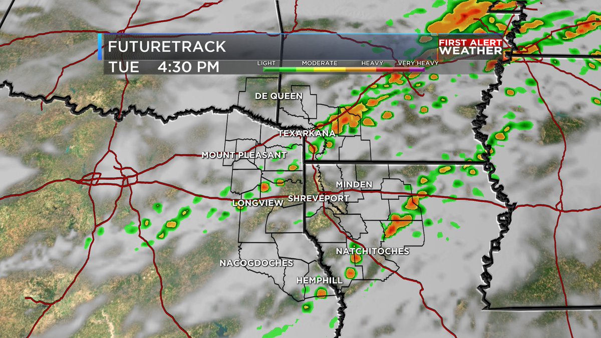 Showers and storms, some possibly strong to severe possible Tuesday afternoon/evening. Primary threats will be damaging winds and hail. Rain is also back tomorrow on MONDAY! More details on KSLA at 10pm.pic.twitter.com/PokncHUdpe