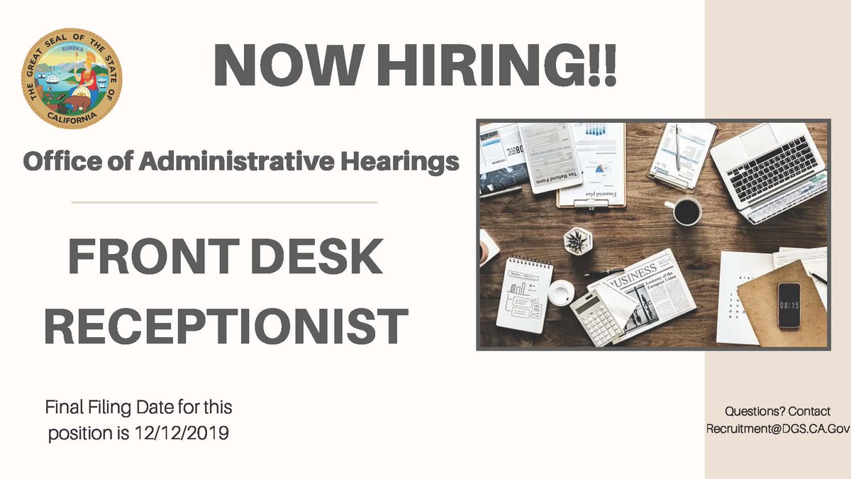 The Office of Administrative Hearings is hiring a Front Desk Receptionist in the Sacramento office! If you are ready to begin your career with the state of California, click the link below and apply today! Contact Recruitment@dgs.ca.gov with any questions. http://bit.ly/37IAYh1 pic.twitter.com/q5wVMDjEJI