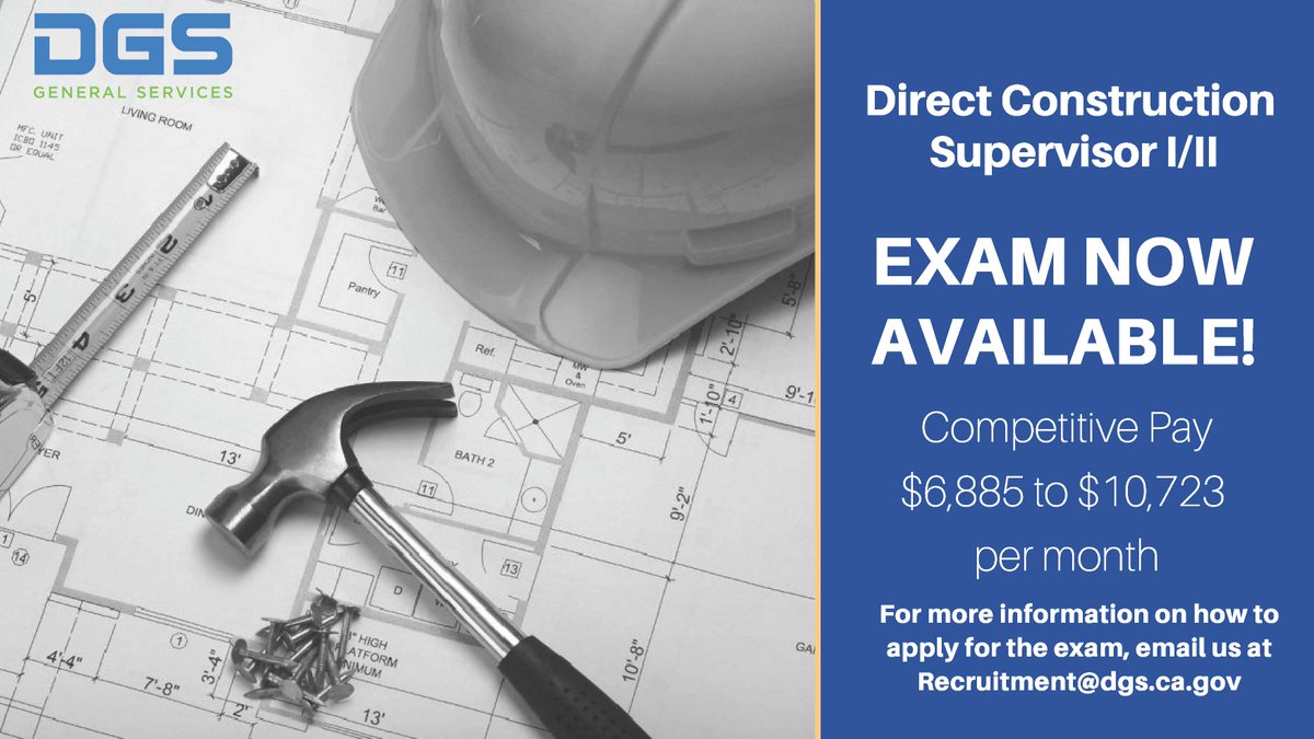 Right now is the time to take the “Direct Construction Supervisor I/II” exams. Contact Recruitment@dgs.ca.gov for more details on how to officially apply. Upcoming deadline is January 6th, 2020. http://bit.ly/2PcJlZM pic.twitter.com/x3qnGhmOO0