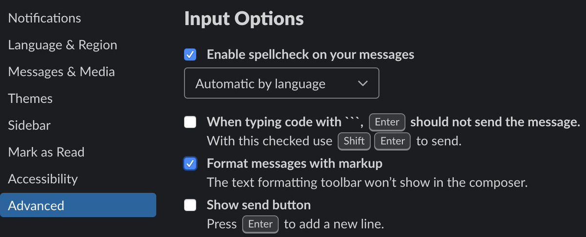 @SlackHQ in the advanced settings category: "Format messages with markup"#TILpic.twitter.com/rNMSlzvOW1