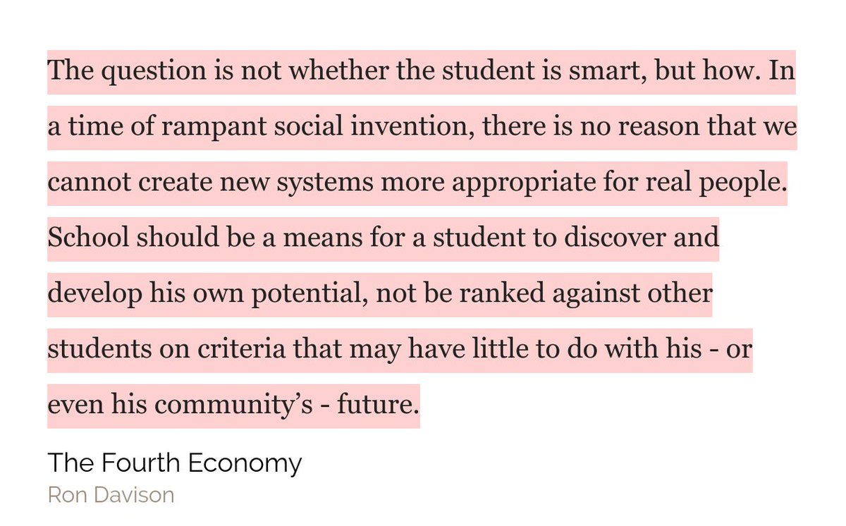"The question is not whether the student is smart, but how ... there is no reason that we cannot create new systems more appropriate for real people. School should be a means for a student to discover and develop his own potential" ~ The Fourth Economy by