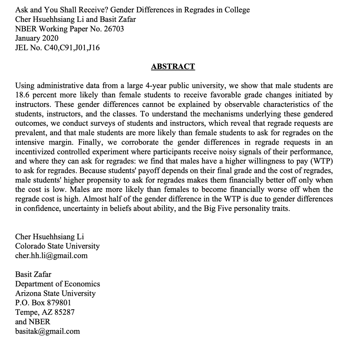 Male students are much more likely to ask for and receive favorable grade changes. Paper: "Ask and You Shall Receive? Gender Differences in Regrades in College" Context: "a large 4-year public university"