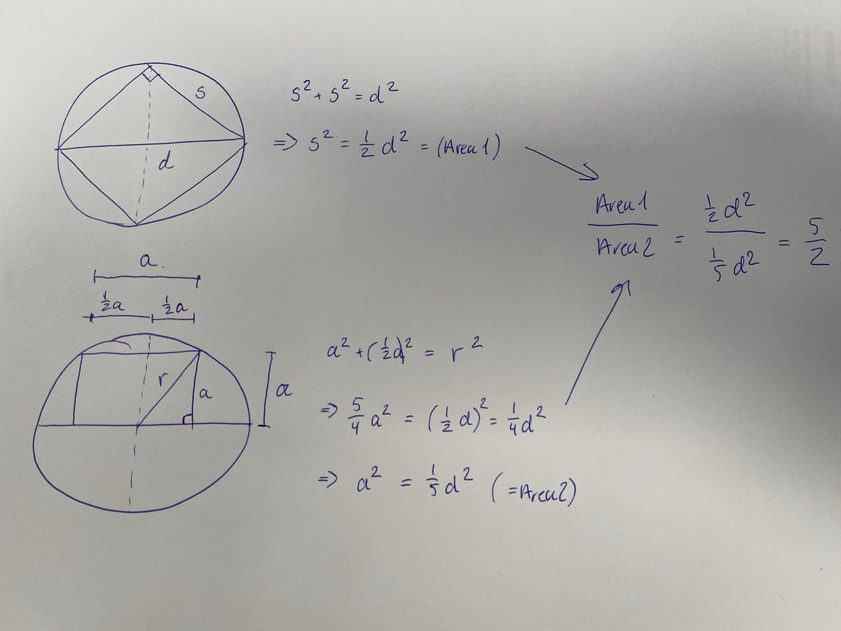 A square inscribed in a semicircle has 2/5 the area of a square inscribed in the circle of the same radius.