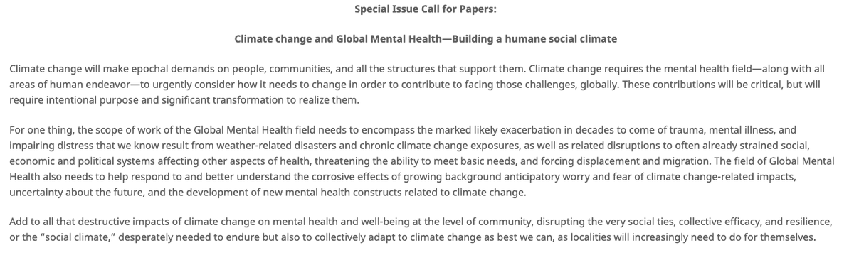 Global Mental Health special issue call for papers: Climate change and Global Mental Health—Building a humane social climate. Deadline to submit 16 March 2020. http://ow.ly/pkJm50y1epm
