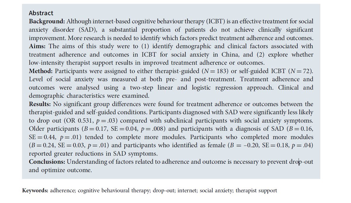 NEW FIRSTVIEW PAPER FROM BCP: Predictors of treatment outcomes and adherence in internet-based cognitive behavioural therapy for social anxiety in China FULL FREE TEXT AVAILABLE VIA