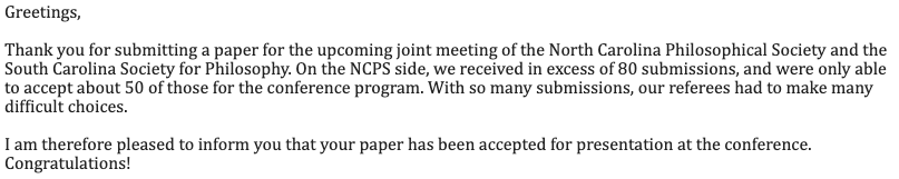 Stoked to be given the opportunity to present my paper "Phenomenology is All Greek to Me: The Influence of Aristotelian Metaphysics on Heidegger's Understanding of 'Being'" at the joint meeting of the North Carolina/South Carolina Philosophical Societies in March!pic.twitter.com/eSlTBi0bal