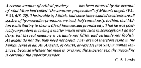John Milton: the angels are all boys and they fuck. also gender isn't real, but ALSO i really like the idea of getting to spend some time as a woman? idk forget i said that. anyway charles diodati is super hot. also jesus is a bottom. CS Lewis, the world's stupidest man:pic.twitter.com/VoXgvF3nkJ