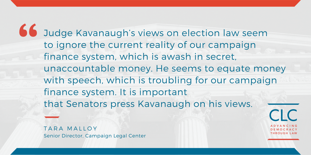 It's extremely important U.S. Senators ask #SCOTUS nominee Brett Kavanaugh questions about his views on democracy issues, especially given his record indicates he opposes reasonable limits on money in politics. CLC's statement: https://campaignlegal.org/press-releases/judge-kavanaughs-views-campaign-finance-and-presidential-power-are-troubling … #SCOTUSPick #WhatsAtStakepic.twitter.com/TZEaDT4hcG