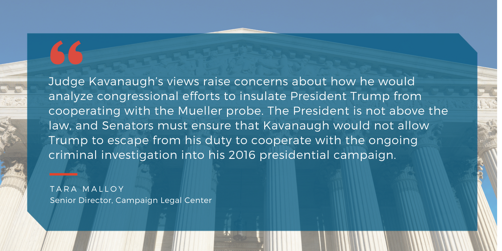 #SCOTUSpick Kavanaugh, in a law review article, said Congress should consider a law exempting the president, while in office, from criminal prosecution & investigation. Senators must ask about Kavanaugh's view on presidential power as it relates to the Mueller probe #WhatsAtStakepic.twitter.com/eEa5h6bsjA