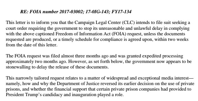 Our letter to @TheJusticeDept says if they keep delaying our #FOIA request on private prison donations, we will sue. http://bit.ly/2rumcbm pic.twitter.com/7p8PxCzrFO