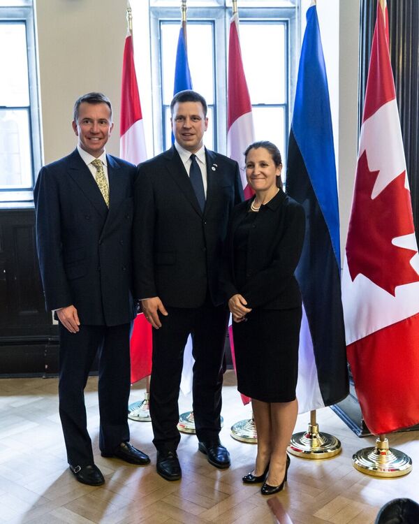 Minister Freeland and @TBS_Canada President Scott Brison co-host a lunch with @ratasjuri to congratulate #Estonia on 100 years of independence & discuss continued partnership on issues such as digital government, #trade, and defending #democracy & rules-based international order.pic.twitter.com/jYdpQHgGYT