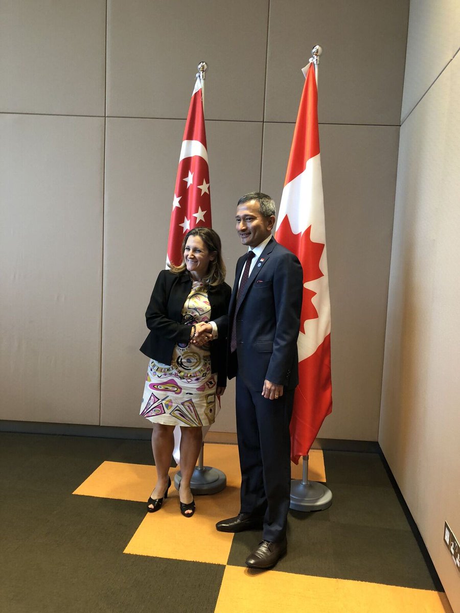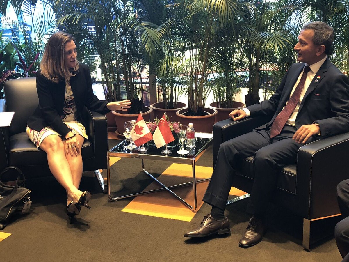 Minister Freeland met w/ #Singapore FM @vivianbala at #ASEAN to discuss engagement w/ Southeast #Asia as well as developing bilateral relationship through free, open #trade, #CPTPP & rules-based int’l order. We look forward to working together to advance shared priorities. @MFAsgpic.twitter.com/D3pFREPe2q