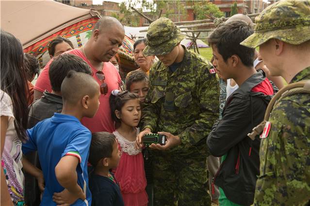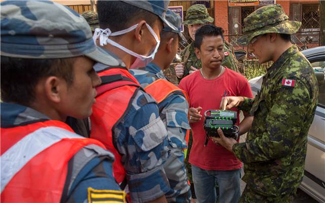 Cpl Yassabi Siwakoti, a member of the @CanadianForces of Nepalese ancestry, distributes crank radios #NepalQuakepic.twitter.com/6hpBECl0FI