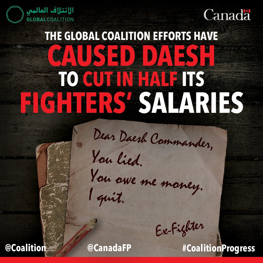 .@coalition efforts cause #Daesh to cut its fighters’ pay #CoalitionProgresspic.twitter.com/lwrmFHc3R6