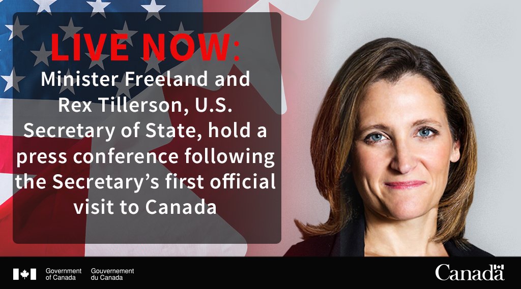 LIVE IN 30 MINUTES: Minister Freeland and Rex Tillerson, #US Secretary of State, hold press conference following the Secretary’s first official visit to Canada #CanUS @statedept http://ow.ly/N8hE30g4ooj pic.twitter.com/A86cB3MEwX