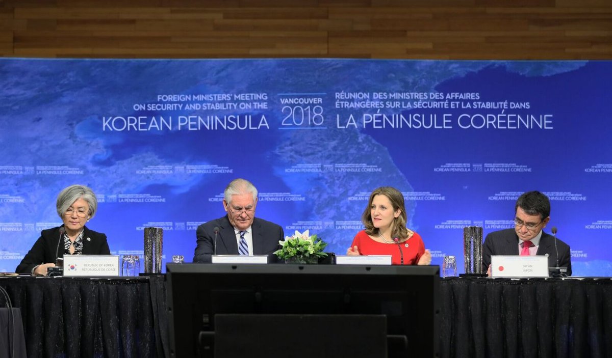 At the opening of #Vancouver Foreign Ministers’ meeting, Minister Freeland reiterates Canada’s resolve to work together with the international community for peace on #KoreanPeninsula & to demonstrate our unity and desire for peaceful, diplomatic solutions to #NorthKorea crisispic.twitter.com/ySo2mO2kKb
