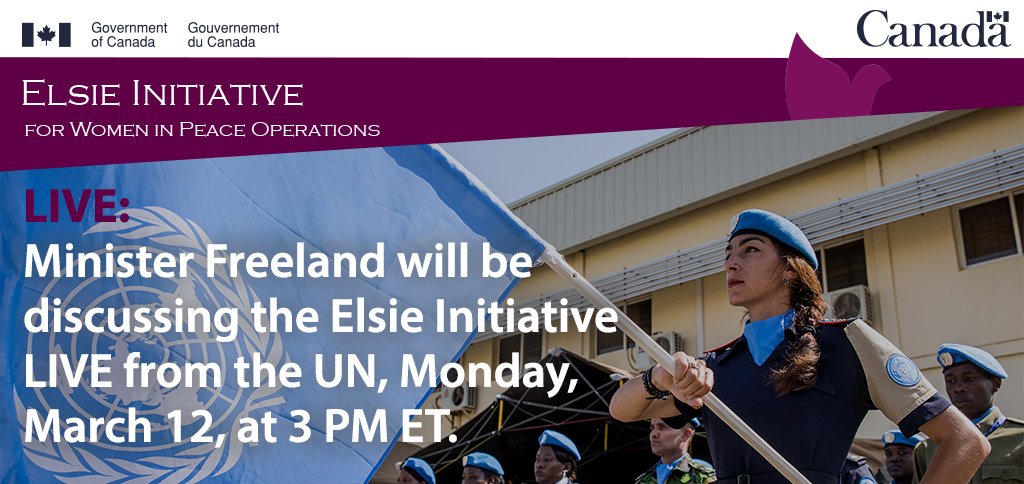 Monday, March 12, 3 PM, LIVE from the @UN, Minister Freeland at an event on the #ElsieInitiative for Women in #PeaceOperations. #WPS http://ow.ly/BPNI30iTut9 pic.twitter.com/pIaqEdXwZo