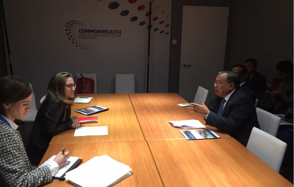 On the margins of #CHOGM2018, Minister Freeland met with the Minister of Foreign Affairs of #Bangladesh Abul Hassan Mahmood Ali and commended his government for opening their arms and borders to hundreds of thousands of #Rohingya seeking refuge.pic.twitter.com/oltX1Eab2b