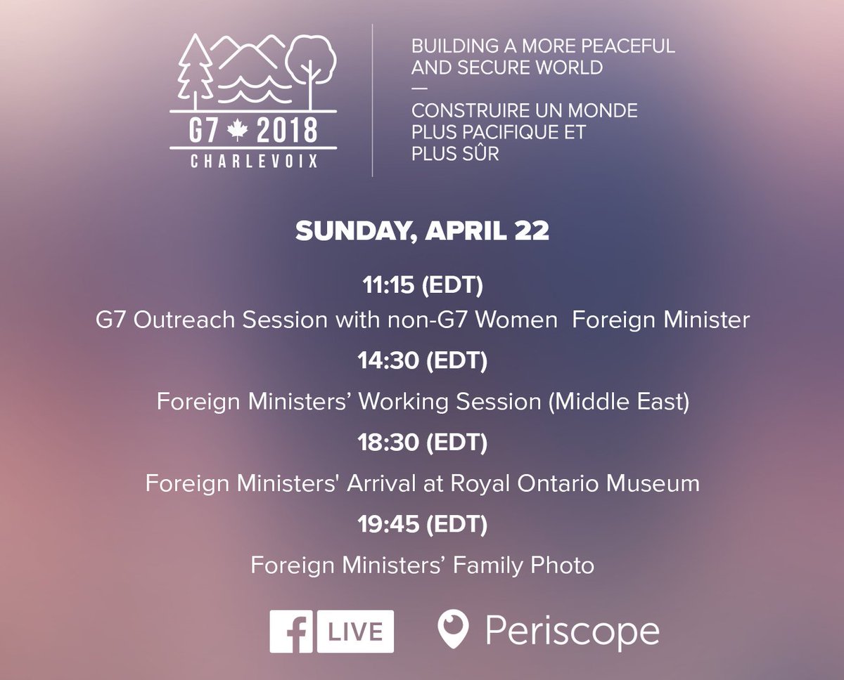 Happening LIVE today! Watch the #G7Charlevoix Ministerial Meeting “Building a More Peaceful and Secure World” on @g7https://twitter.com/g7/status/987848810239025152 …