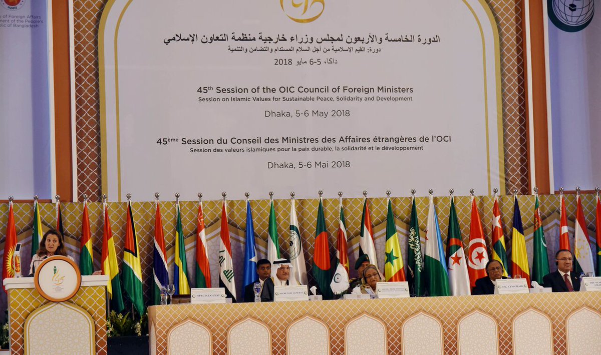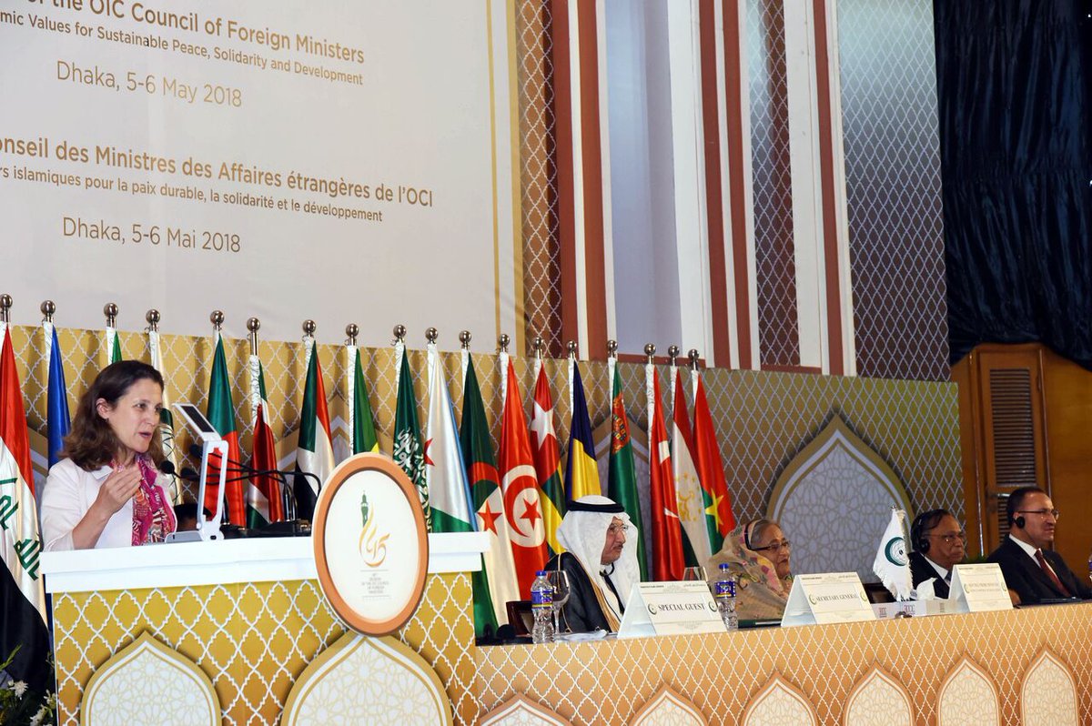 Minister Freeland gives her keynote speech at the 45th Session of the @OIC_OCI Council of Foreign Ministers. This is the first time a non-member minister is invited to address the Council. Photo credit – Bangladesh’s Prime Minister’s Office.pic.twitter.com/ZvKp2WEVXZ