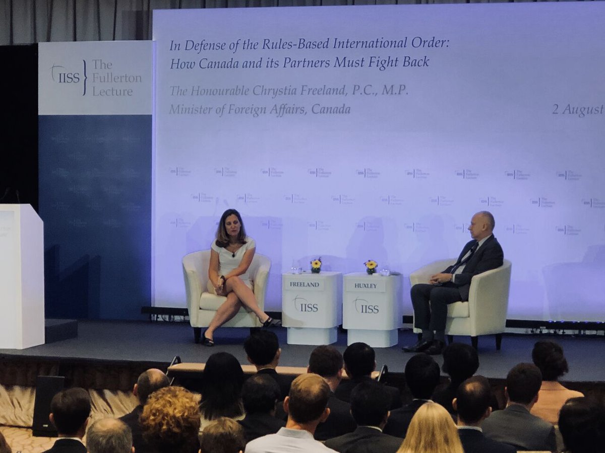 En marge réunions #ANASE, la min. Freeland a prononcé discours à la conférence Fullerton @IISS_org sur importance ordre international fondé sur des règles. Av nos partenaires en #Asie, nous continuerons à défendre #démocratie & construire ordre mondial + fort et + juste pr tous.pic.twitter.com/mfrEBSaEM6