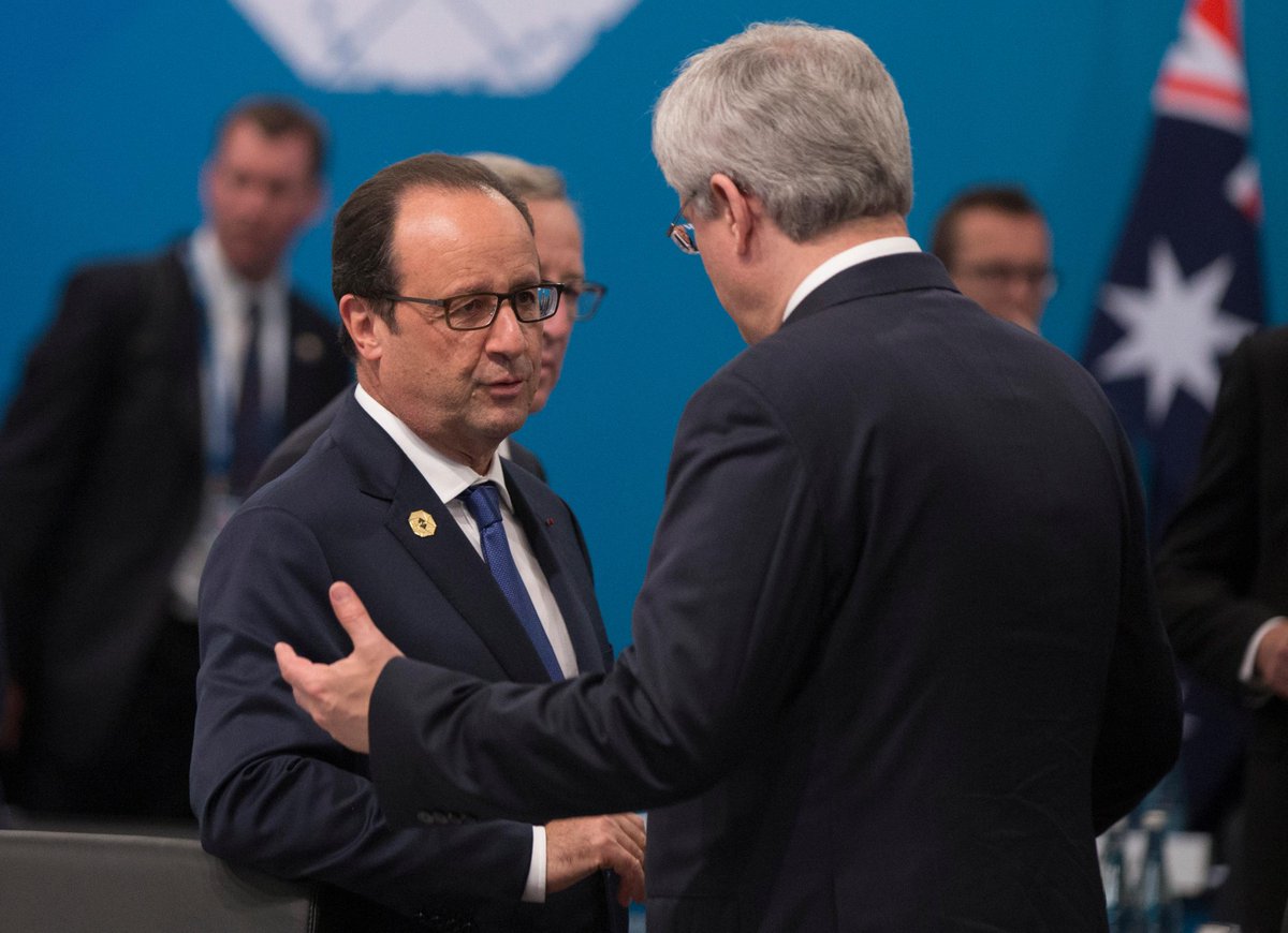.@premierministre discute avec @fhollande, Président français, avant une séance de travail du #G20 #G20Brisbanepic.twitter.com/3I24UFrHV2