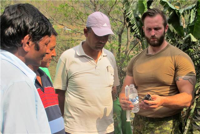 Sgt Scott Coulter, EICC, montre comment se servir d’un purificateur d’eau portatif aux résidents de Sukute, au #Népalpic.twitter.com/pT8uvSjWOy