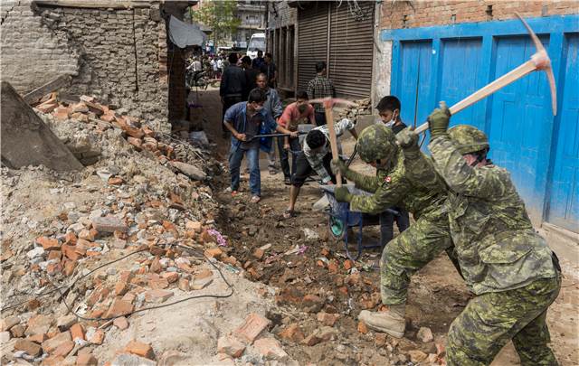 Des résidents locaux aident des membres du 4e Régiment d’appui du génie des FC à nettoyer une rue à Sankhu au #Népalpic.twitter.com/NcGPuRX11t