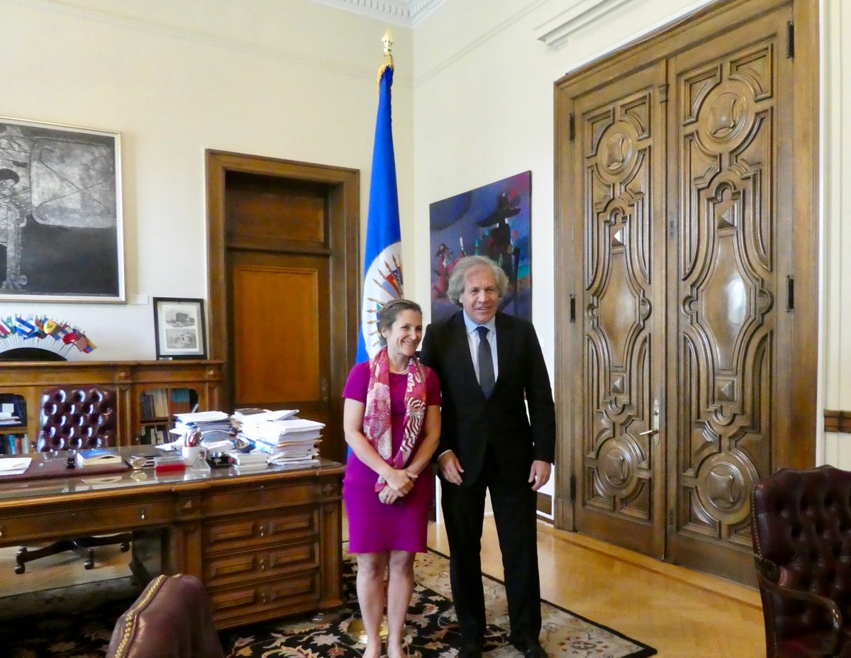 La min. Freeland rencontre @Almagro_OEA2015 pour discuter engagement du Canada avec partenaires OEA pr retour ordre démocratique #Venezuelapic.twitter.com/VMRPFpE0x6