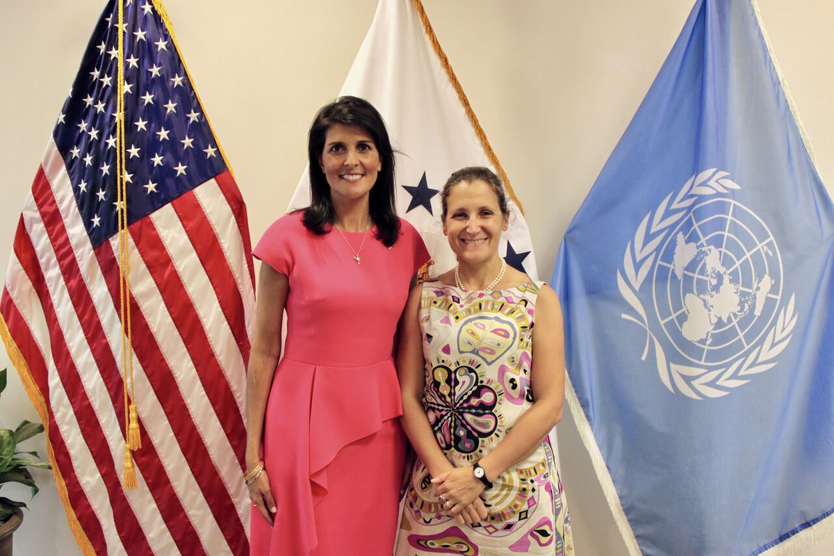 La ministre Freeland rencontre @nikkihaley, ambassadrice #ÉtatsUnis à #ONU, pour discuter priorités en matière de paix & sécurité mondialepic.twitter.com/2VIkEXz1VY