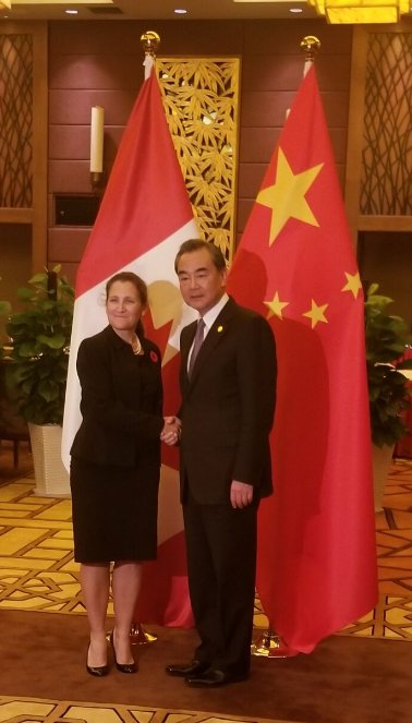 La ministre Freeland avec le ministre des Affaires étrangères de Chine, Wang Yi. Les deux ministres ont discuté de relations bilatérales, ainsi que des #droitsdelapersonne #APEC2017pic.twitter.com/nnx2Eg8Co1
