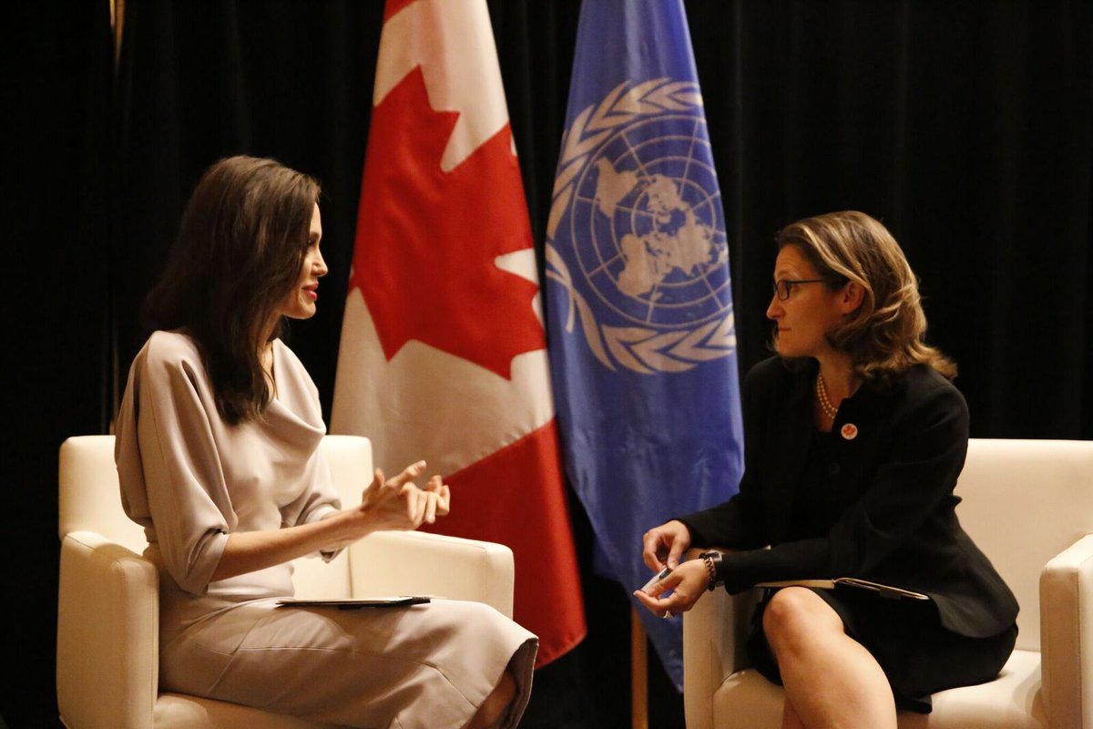 La ministre Freeland et Angelina Jolie, Envoyée spéciale du Haut-commissaire pour les réfugiés de @ONU_fr discutent d'une approche globale pour protéger les #EnfantsSoldats dans les conflits armés #ConfPaix17pic.twitter.com/WvpI4NzkQu